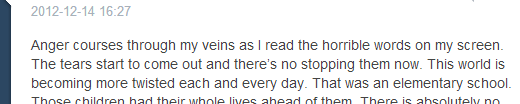 Most importantly though, my heart goes out to all those affected by this. I can't even imagine how the families of those who lost children (and just before the winter holidays at that) are coping with this. Stay strong, Connecticut.